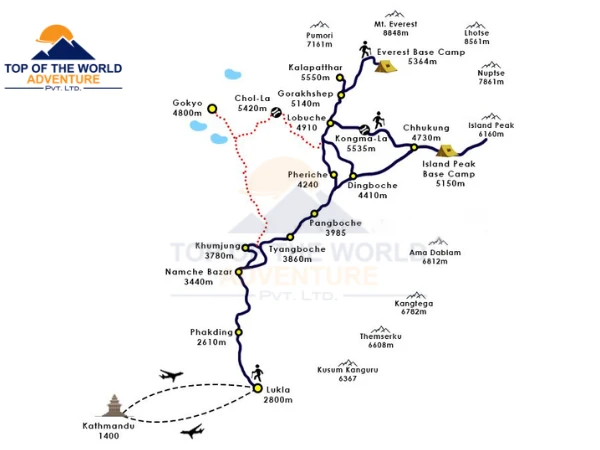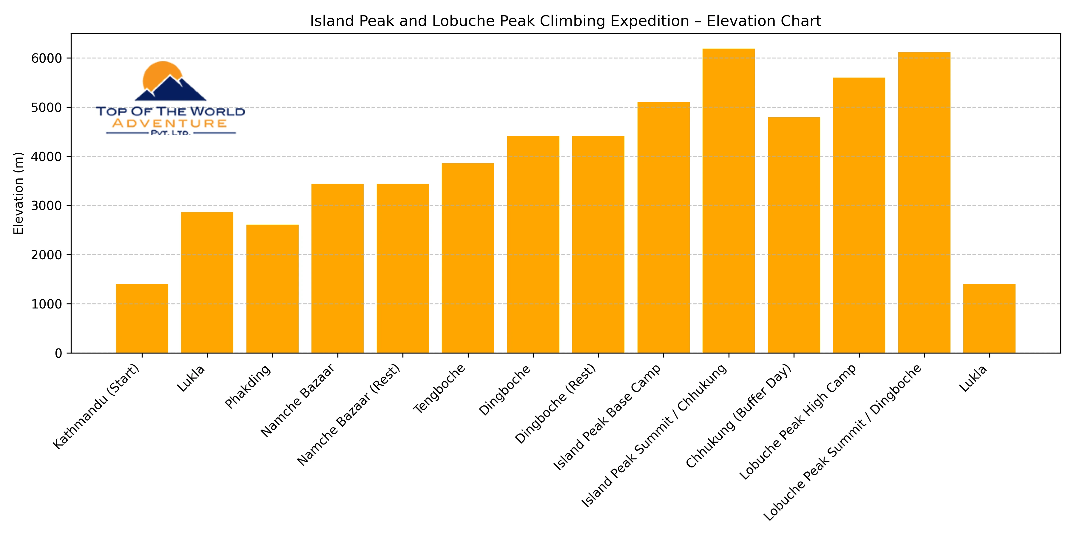 The journey begins in Kathmandu, followed by a scenic flight to Lukla and a gentle trek through the Dudh Koshi Valley. After reaching Namche Bazaar, trekkers acclimatize with a short hike to Everest View Hotel. The route continues through Tengboche and Dingboche, with a rest day for altitude adjustment before heading to Island Peak Base Camp. After summiting Island Peak, climbers descend to Chhukung and prepare for Lobuche Peak. Following the second summit, a helicopter from Dingboche offers a breathtaking return to Lukla, concluding with a short flight back to Kathmandu.