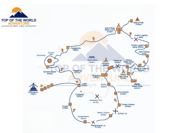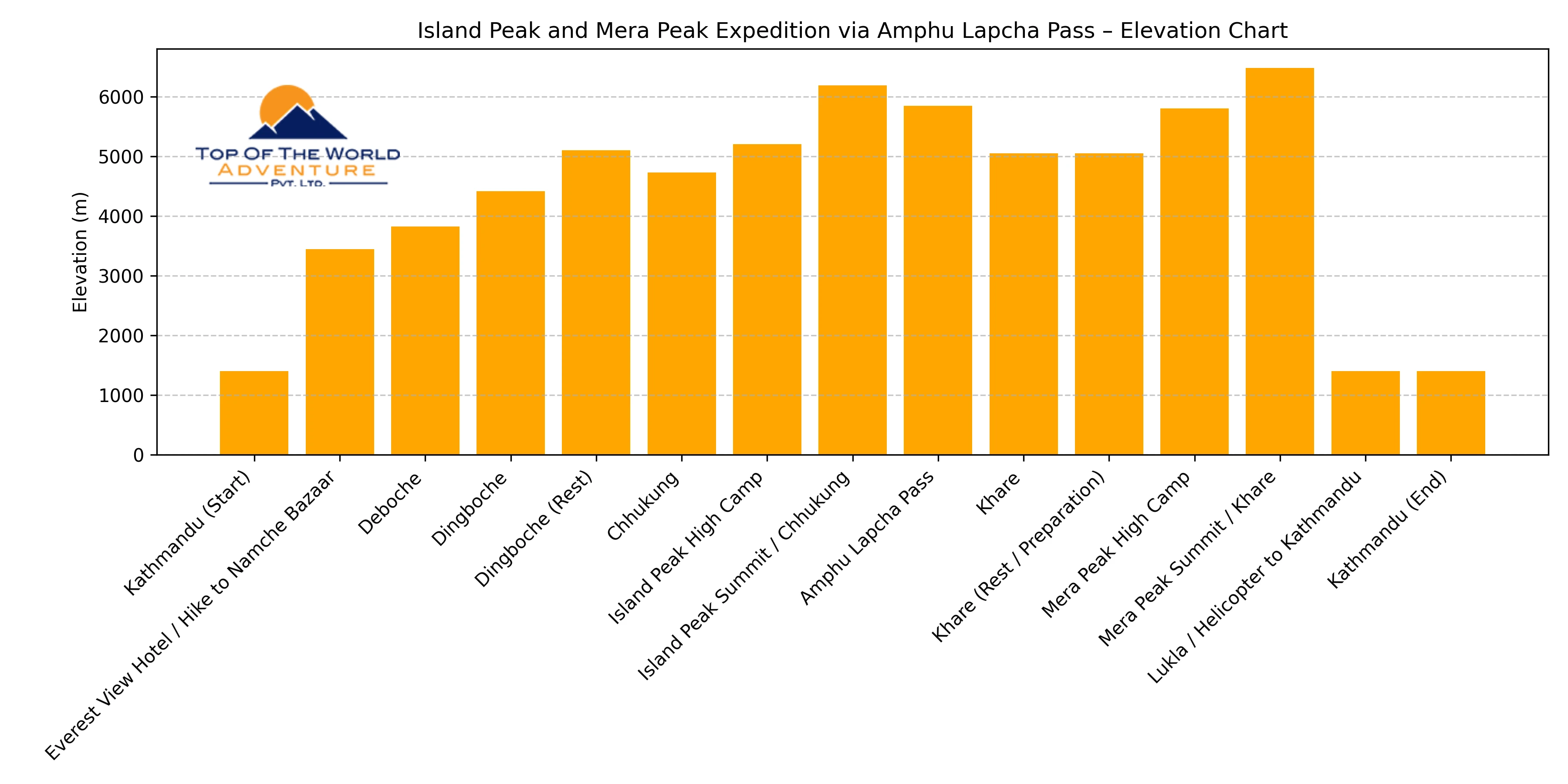 The expedition begins in Kathmandu, where you take a helicopter to the Everest View Hotel for acclimatization. The trek continues through Namche Bazaar, Deboche, and Dingboche before the first summit attempt on Island Peak. The route then traverses the wild and challenging Amphu Lapcha Pass leading into the Hinku Valley, from where the Mera Peak climb begins. The adventure concludes with a scenic helicopter flight from Khare to Lukla and Kathmandu, combining thrill, comfort, and efficiency.